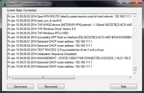 12、此时会弹出名为OpenVPN Connection的窗口,等待几分钟直至VPN成功,图标变为绿色: